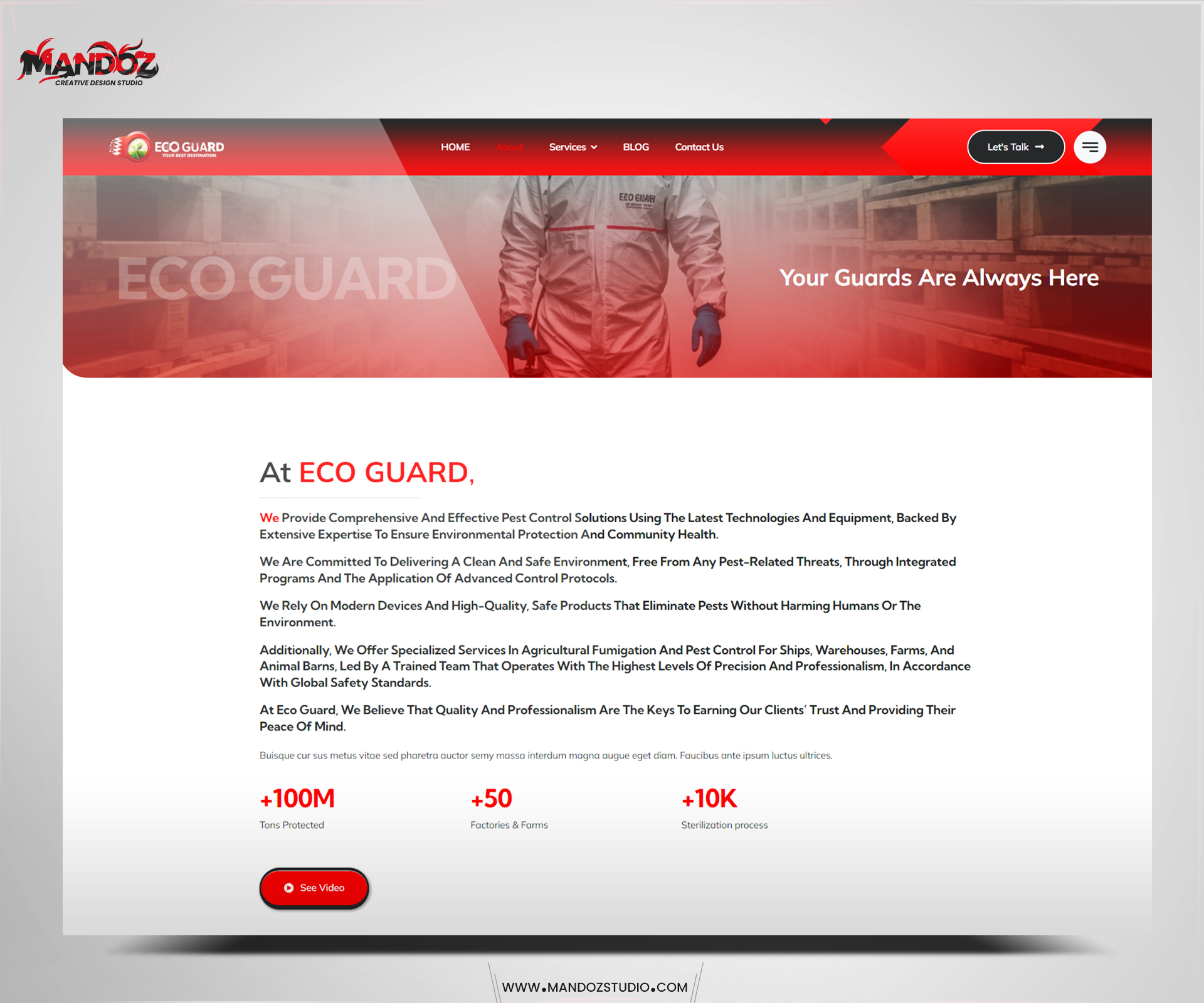 تم بناء الموقع بتصميم عصري ومتجاوب يتناسب مع جميع الأجهزة، مع لغة بصرية متناسقة مع هوية الشركة، وتكامل تقني يضمن سرعة الأداء وسهولة التصفح. كما تم التركيز على إبراز خدمات شركة إيكو جارد وإنجازاتها بطريقة جذابة تعزز ثقة العملاء والشركاء.